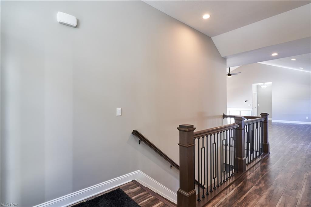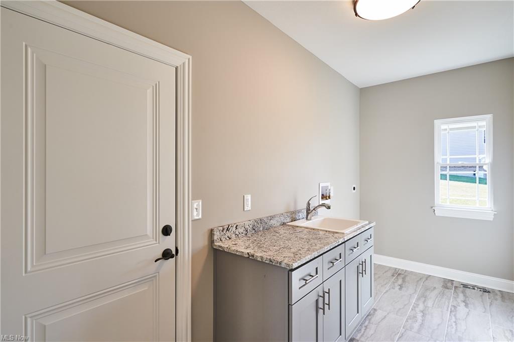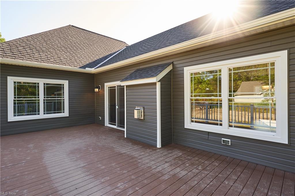 Eat-in kitchen features an expansive center island with counter seating, granite countertops and is completely open to the greatroom which opens up to a 28×14 deck.