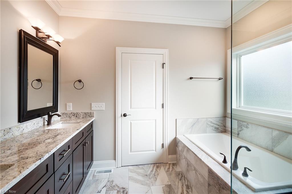 Eat-in kitchen features granite countertops with counter seating, stainless steel appliances and is open to the great room and dining areas.