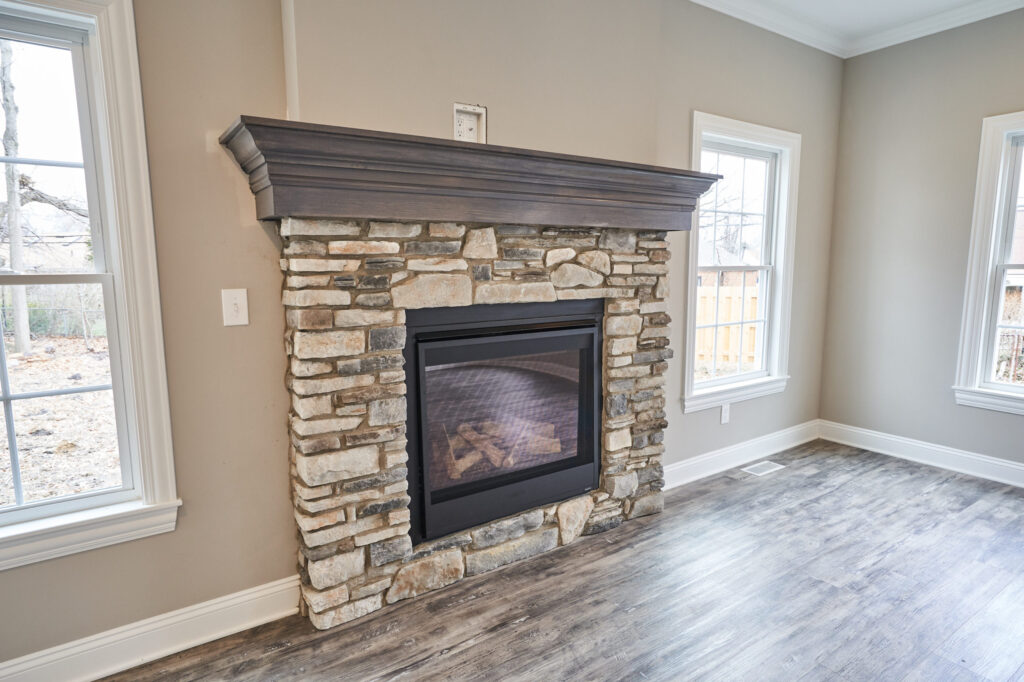Inviting front porch with pillars. Eat-in kitchen features granite countertops, a tile backsplash, and an island. Greatroom with gas fireplace encased in stone.