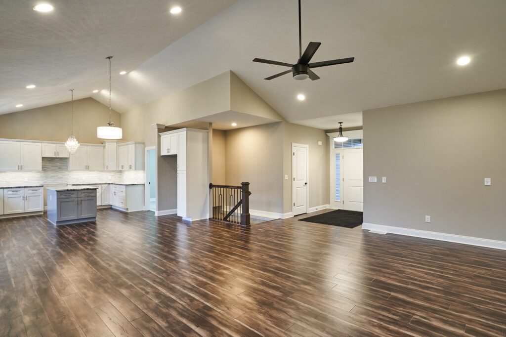 Contemporary ranch with vaulted ceilings and an open floorplan.