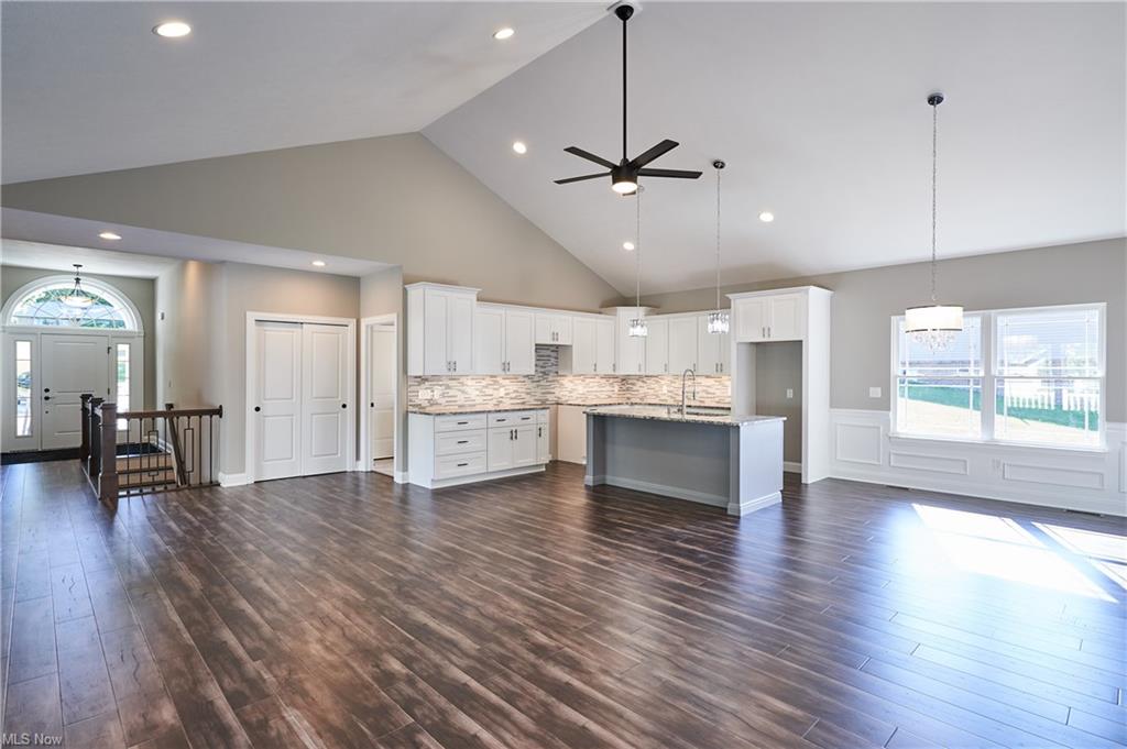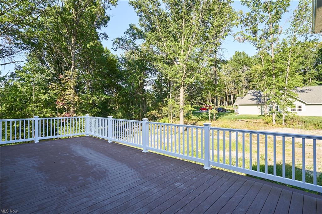 Eat-in kitchen features an expansive center island with counter seating, granite countertops and is completely open to the greatroom which opens up to a 28×14 deck.